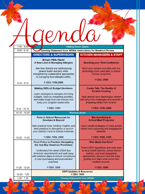 WSNA is excited to host the 2025 Virtual Fall Workshop on Saturday, November 15, 2025, from 8:00 a.m. – 1:30 p.m. This half-day professional development event will once again be held online, making it easy for child nutrition professionals across the state to participate. Registration Closes Thursday, November 13, 2025. This year’s workshop is designed with two learning tracks—one tailored for directors and supervisors, and another for kitchen managers and frontline staff. Our goal was to bring forward topics that directly address the challenges and opportunities school nutrition teams are facing right now. From managing food allergies and scratch cooking to farm-to-school resources, merchandising strategies, and the new Buy American provisions, the sessions will be both practical and inspiring.